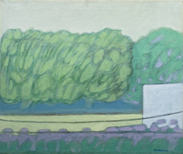 窓から、あるいは散歩で見かけた風景が繰り返し描かれ、作家の静かな私生活から生み出された絵画です。あたかも自身の過去と現在をつなぐ試みのように、海峡の光を受ける水平線を中心とした構図を生涯を通して実験しています。また、抽象化された風景は年を追うごとに、より完成されたフォルムになっていきます。今回の展覧会では1970年代後半より晩年の2005年までの風景を中心にした作品油彩9点、水彩2点を展示いたします。海峡の輝く青や紫、空の桃色、クリーム色、木々や茂みに宿る緑のバラエティ、アレルッツォの作品に現れる色彩は喜びといえるでしょう。メッシーナ海峡を渡る風、地中海の光溢れるサンティ・アレルッツォの作品と出会っていただければ幸いです。
